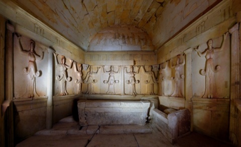 Dos camas funerarias, con huesos humanos y ofrendas, fueron descubiertas en la cámara central. A partir de los detalles en la piedra fue posible reconstruir la fachada de la tumba cerrada con tres puertas de piedra. Como un símbolo de la frontera entre la vida y la muerte. En el centro de la composición la diosa está ofreciendo una corona de oro a un caballero frente a ella. A ambos lados de ellos hay procesiones de los funcionarios con armaduras portadores diferentes regalos en sus manos.